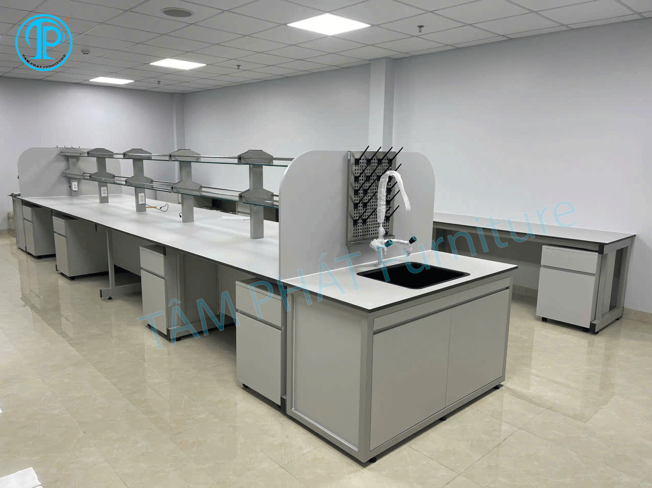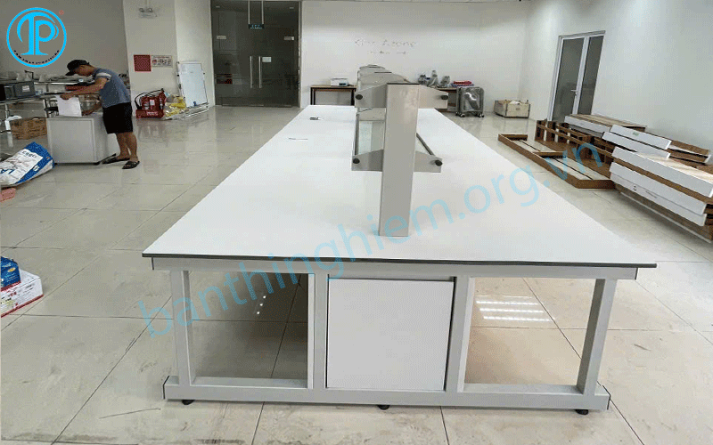 Bàn thí nghiệm trung tâm thường được bố trí ở vị trí trung tâm của phòng lab, nơi diễn ra các thao tác chính như cân hóa chất, pha chế, phân tích mẫu, sử dụng thiết bị đo đạc. Do đó, bàn phải chịu được tải trọng lớn, ma sát cao, va đập thường xuyên và điều kiện môi trường khắc nghiệt như độ ẩm, hóa chất, nhiệt độ cao.